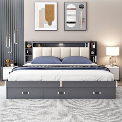 MODERN UPHOLSTERED STORAGE BED FRAME WITH BUILT-IN HEADBOARD SHELVES
