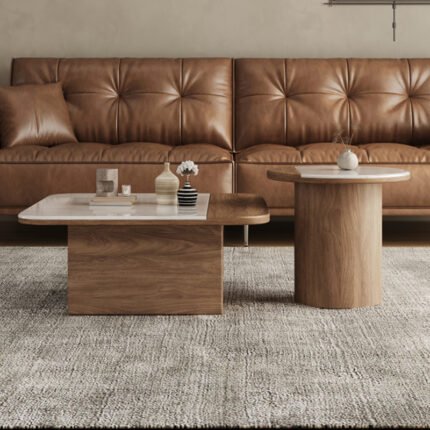 MODERN TUFTED LEATHER SOFA WOOD & MARBLE CENTER TABLE SET
