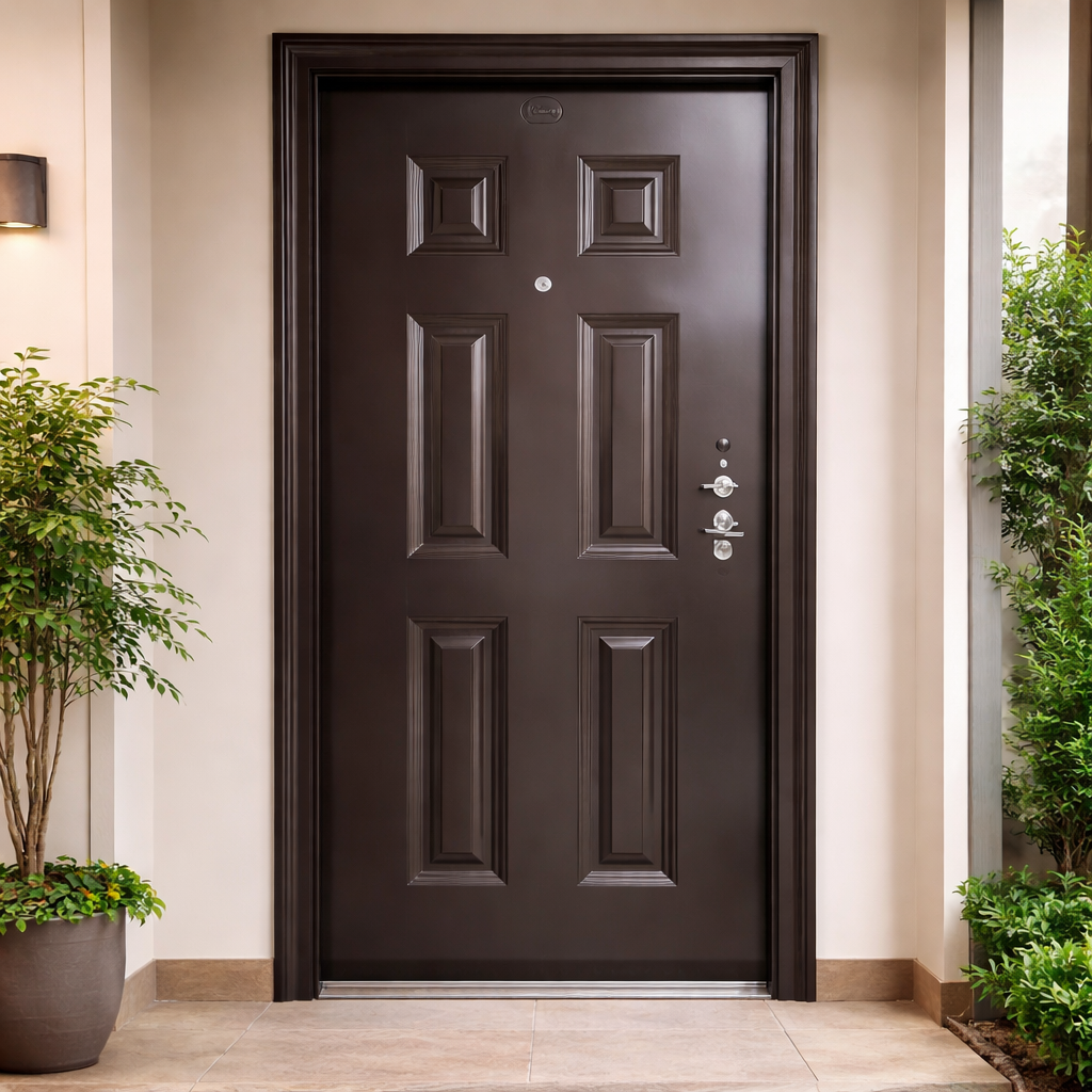 The door features a classic six-panel design that adds a touch of elegance and sophistication to any entrance. Its rich dark brown finish gives it a stylish and premium appearance that blends perfectly with modern or traditional buildings. Beyond its attractive look, the finish also helps resist scratches, rust, and everyday wear, ensuring the door maintains its beauty for many years.
