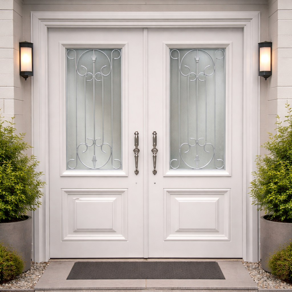 A classic white double security door featuring decorative frosted glass panels with elegant metal designs. It combines timeless style, natural light entry, and strong construction, making it ideal for stylish and secure main entrances.