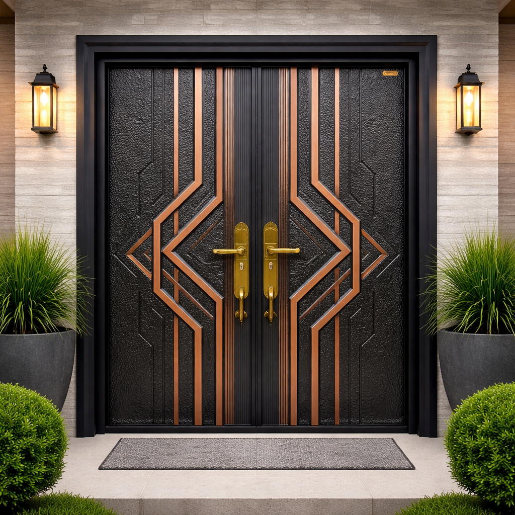A sleek double door featuring bold geometric patterns with copper-toned accents set against a textured dark surface. Its modern design combines symmetry, elegance, and a strong, luxurious presence.