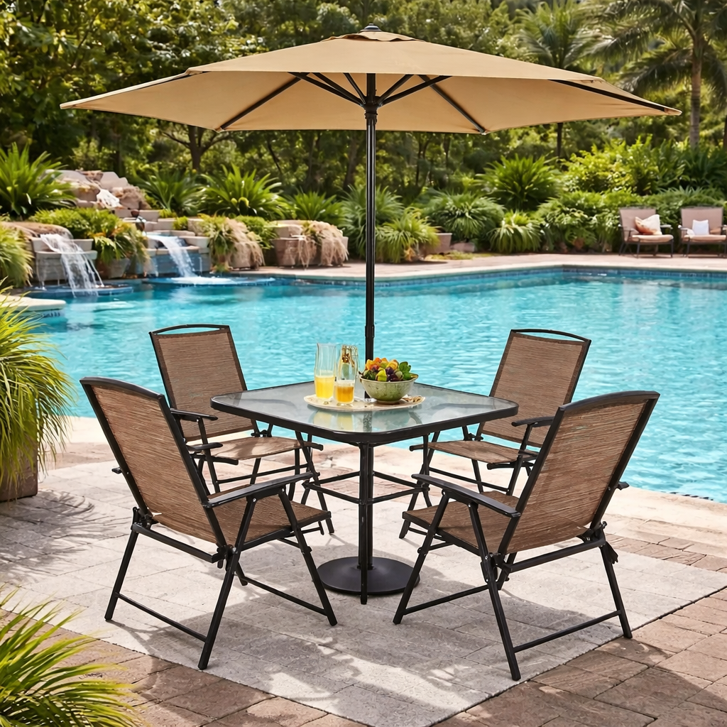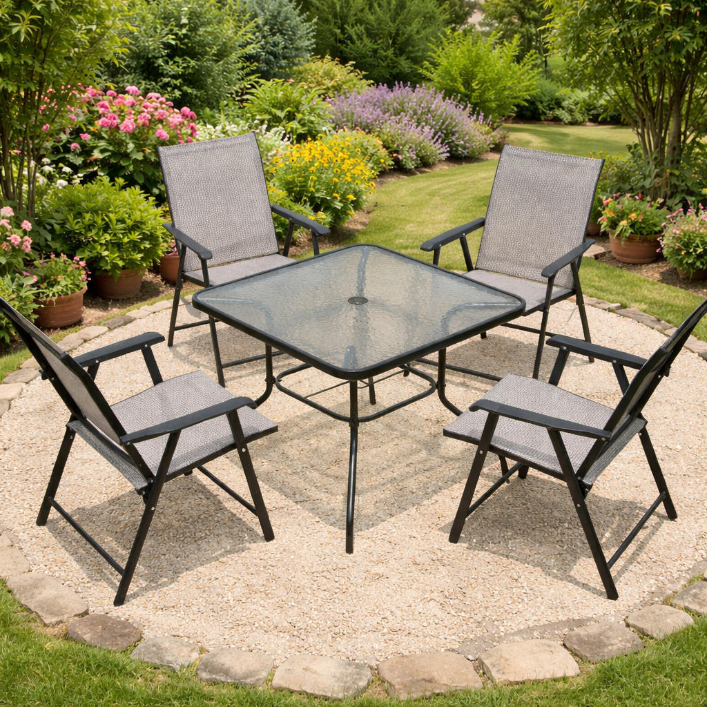 Surrounding the table are four beautifully crafted chairs featuring supportive armrests and breathable mesh backrests. The ergonomic design ensures lasting comfort, allowing you and your guests to sit back and unwind for hours without discomfort. The strong metal frames offer excellent durability and stability, making the chairs reliable for long-term outdoor use. Their foldable structure also adds convenience, allowing for easy storage and space-saving when not in use.