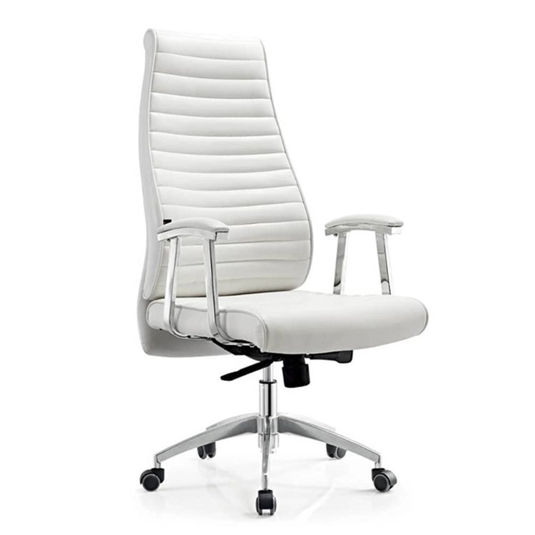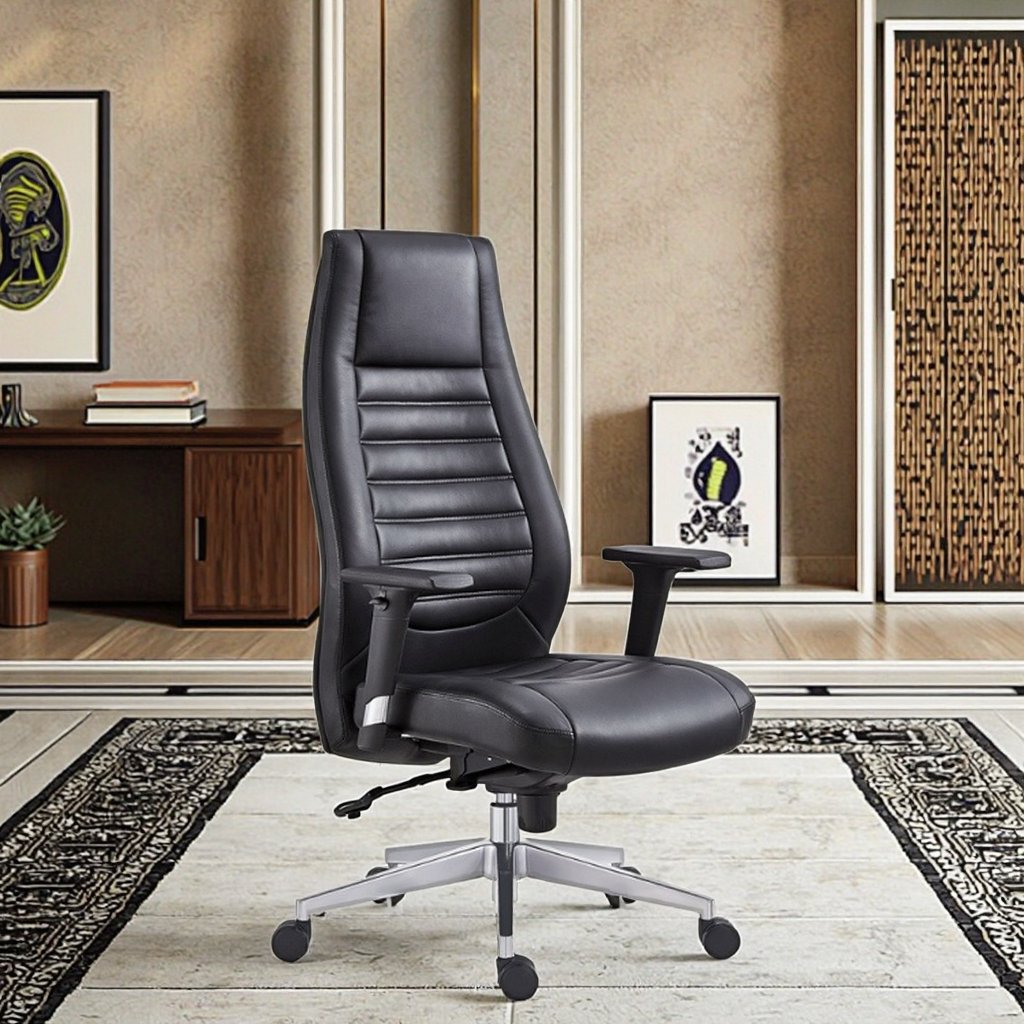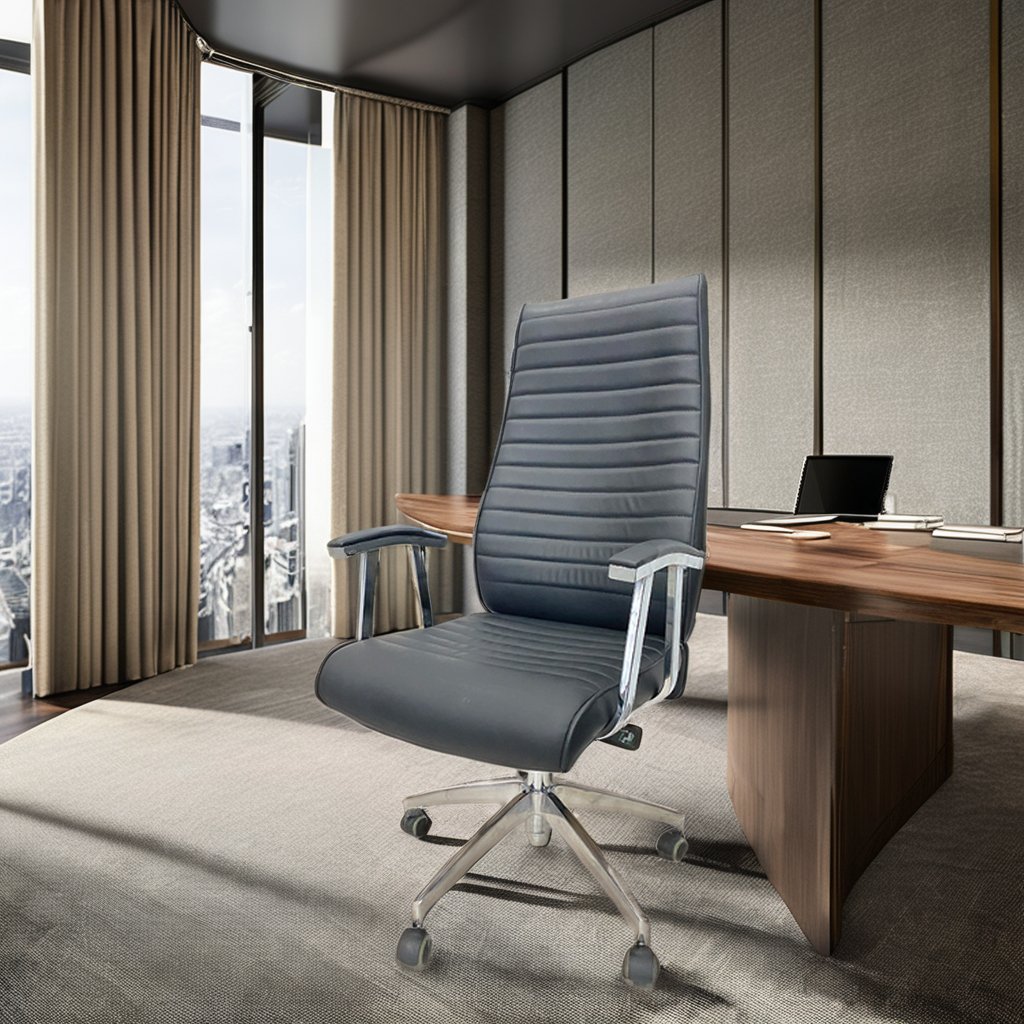 This executive swivel office chair is designed to make a strong impression while delivering exceptional comfort throughout the workday. Its high-back profile is generously padded with horizontal cushioning that supports the spine from the lower back up to the shoulders, helping reduce fatigue during long hours of sitting. The contoured backrest encourages proper posture, making it ideal for focused work, meetings, and extended desk use.