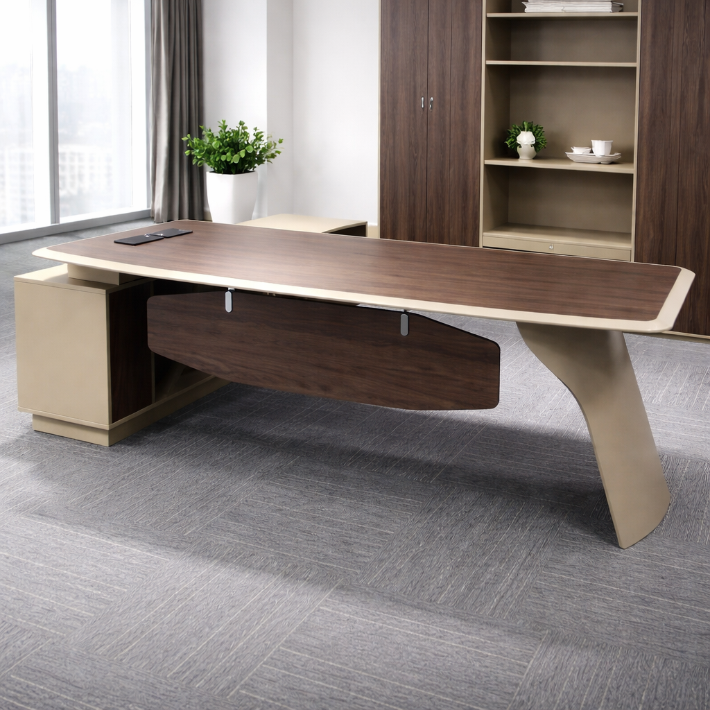 The sturdy base construction ensures exceptional stability and long-term durability. Its thick panel support and reinforced structure provide strength without sacrificing elegance. The modern two-tone finish blends neutral tones with contemporary styling, making it suitable for executive offices, corporate environments, and premium home offices.