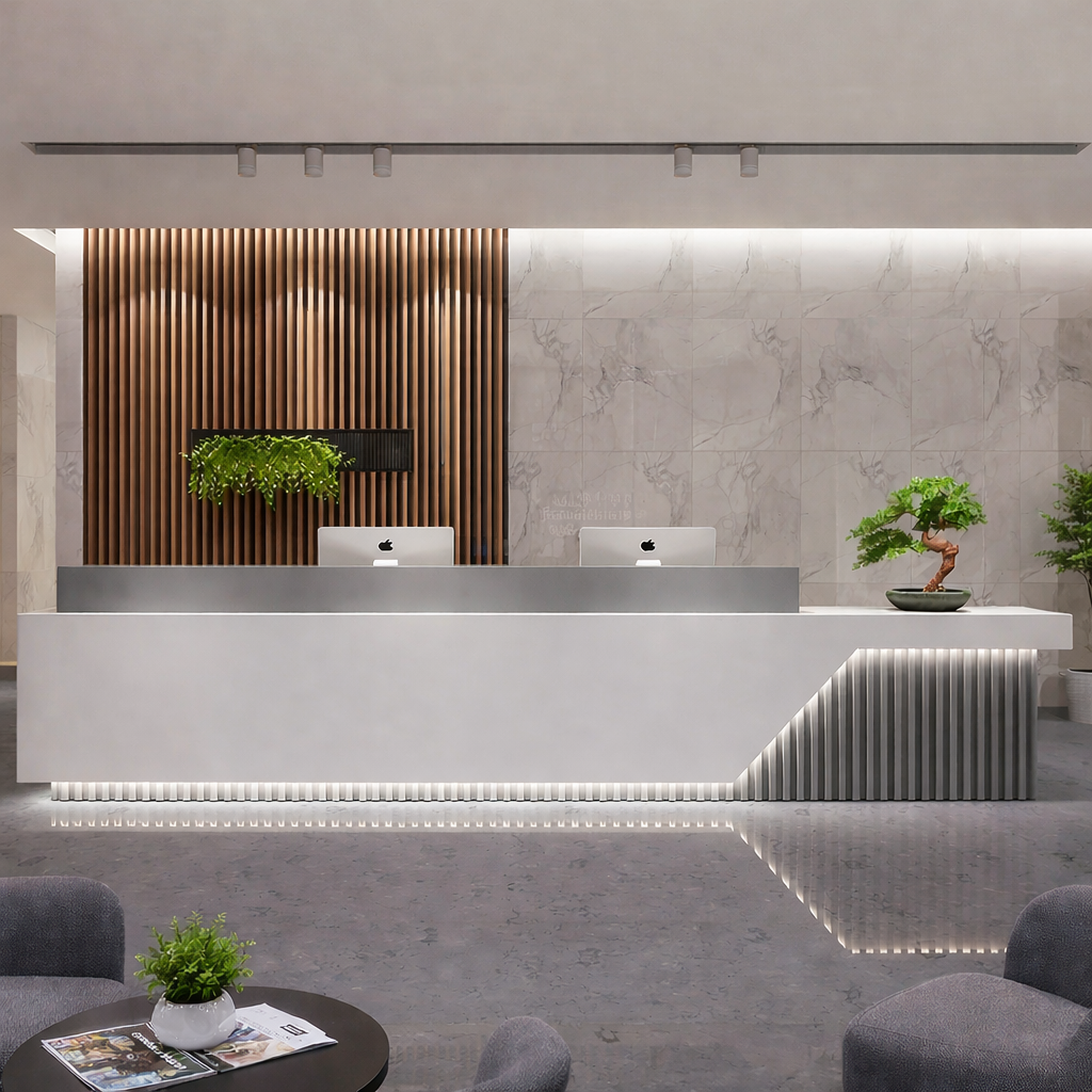 The front façade is enhanced by vertical ribbed paneling on the corner section, adding texture and depth without overwhelming the minimalist aesthetic. This detail does more than decorate; it softens the visual bulk of the desk, prevents the surface from looking flat, and helps disguise fingerprints and minor scuffs — ideal for high-traffic areas such as offices, clinics, hotels, and corporate lobbies.