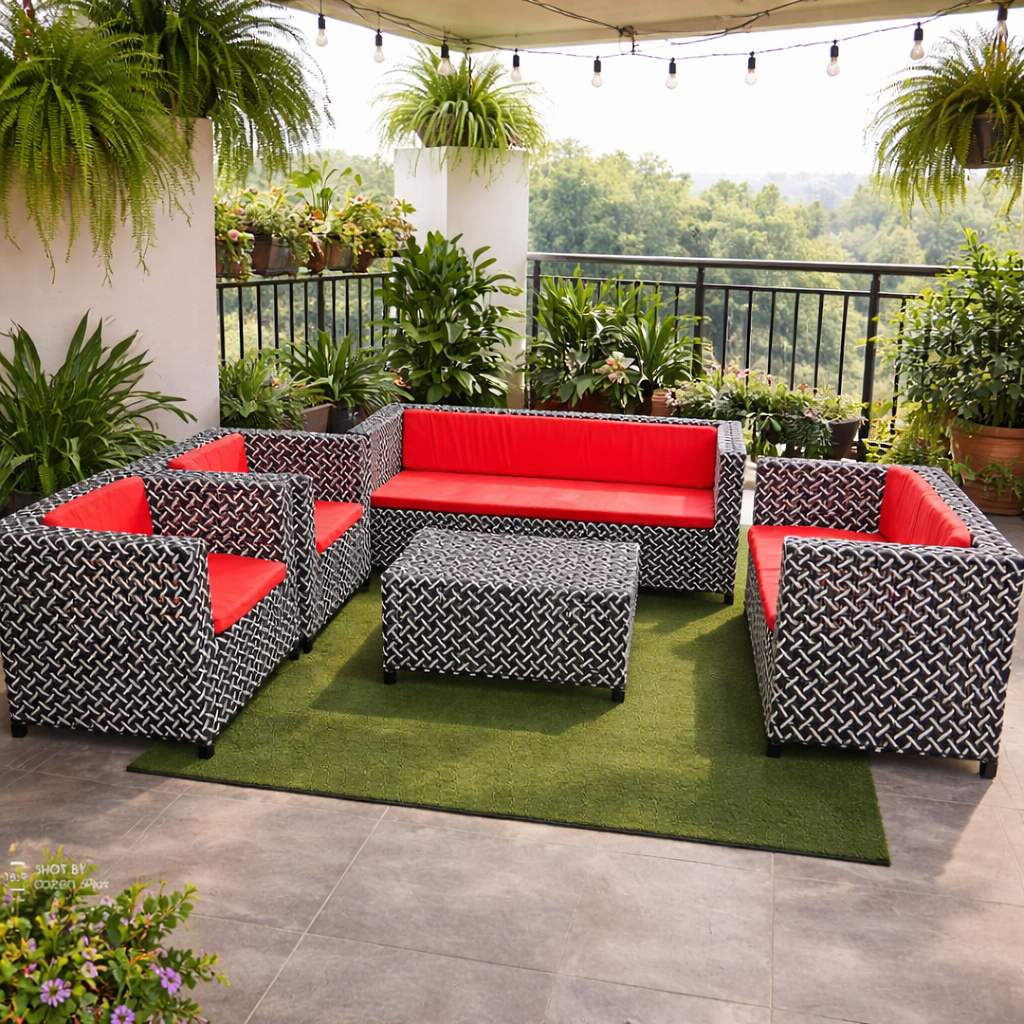 A stylish all-weather outdoor conversation set featuring a handwoven rattan wicker frame, a spacious 3-seater sofa, two lounge armchairs, a single accent chair, and a matching coffee table. Finished with thick coral weather-resistant cushions, it offers durable comfort and an inviting setup perfect for patios, gardens, balconies, and poolside relaxation.