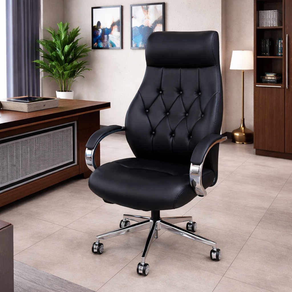 Upholstered in premium black leather, this chair immediately commands attention with its rich texture and refined appearance. The diamond-tufted backrest, accented with carefully positioned button detailing, adds a timeless executive elegance that elevates any office environment. This classic tufting is not only visually striking but also enhances the cushioning structure, ensuring even weight distribution and long-lasting comfort.
