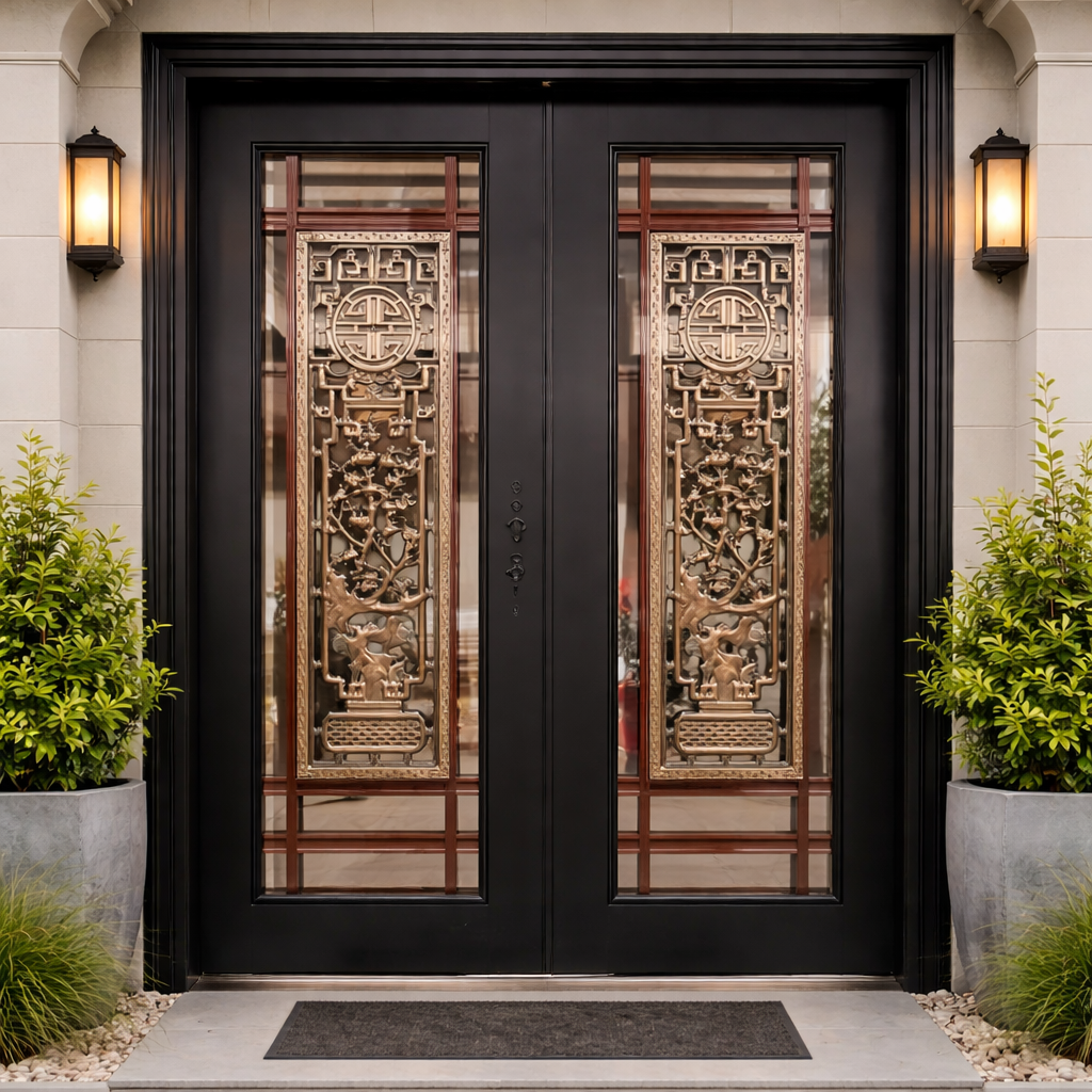 This door is a breathtaking fusion of luxury, artistry, and strength—designed not just as an entryway, but as a powerful statement of elegance and prestige. The bold black frame immediately commands attention, offering a sleek, modern foundation that exudes confidence and durability. Its smooth, refined finish enhances its upscale appearance, making it suitable for high-end homes or distinguished spaces.