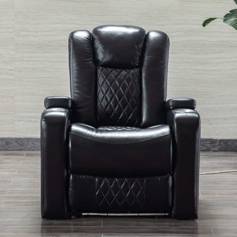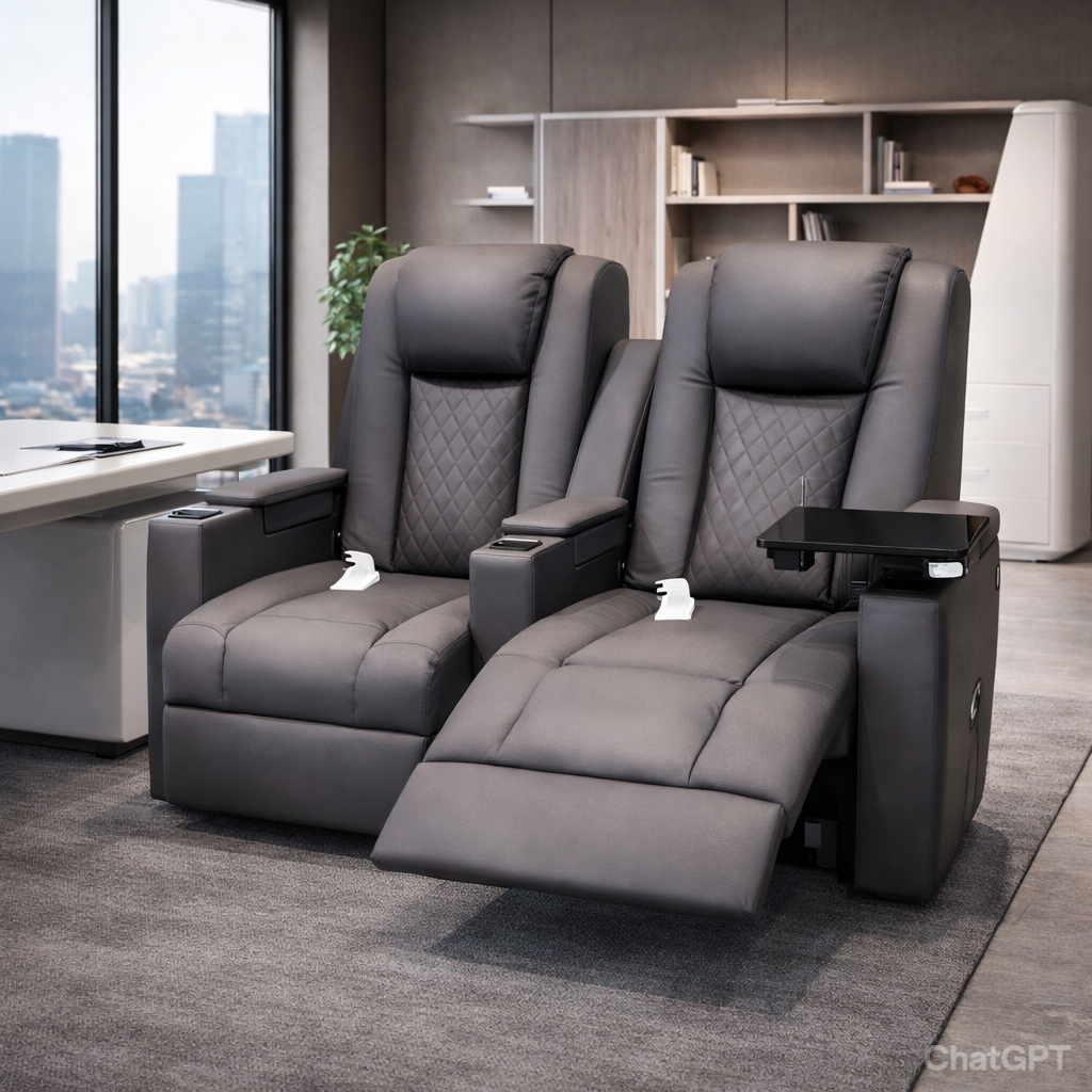 The chair has two generously padded reclining seats upholstered in smooth, durable material that is both soft to the touch and easy to maintain. Each seat includes a high backrest with thick cushioning and integrated headrest support, promoting proper posture during long work hours while reducing neck and upper-back fatigue. The quilted back panels enhance airflow and distribute pressure evenly across the spine, making extended sitting far more comfortable than standard office seating.
