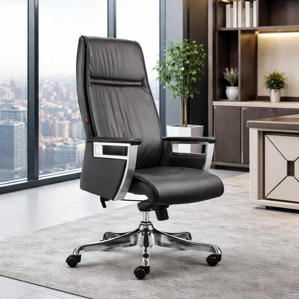 This luxury high-back executive office chair combines premium comfort with a sleek, professional design. Featuring soft leather upholstery, built-in lumbar support, padded armrests, and smooth height and tilt adjustments, it delivers all-day comfort and proper posture support. The sturdy chrome base with caster wheels adds durability, stability, and effortless mobility—perfect for any executive workspace.