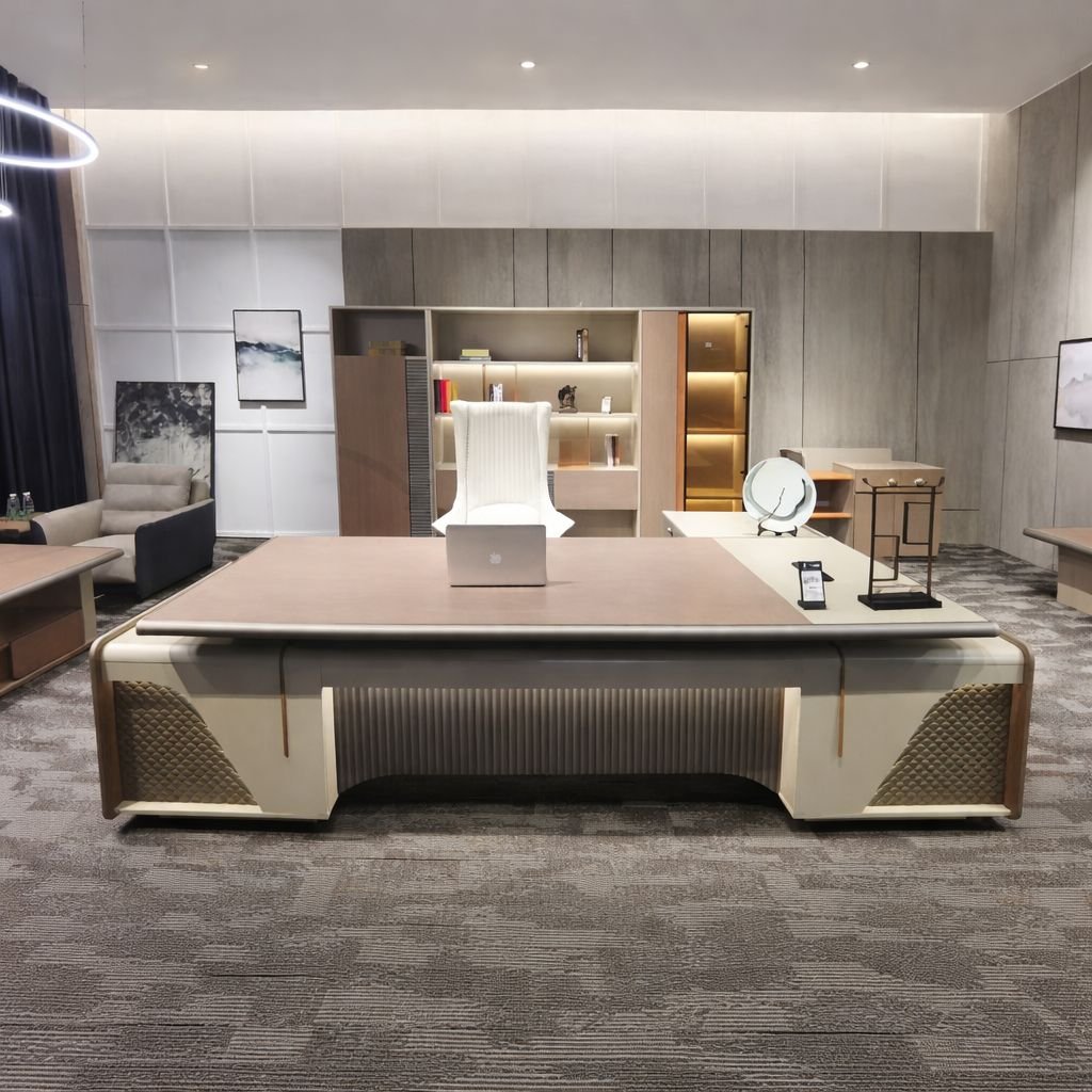 Expertly crafted with premium materials and elegant accent detailing, the desk features a bold architectural structure that conveys strength and stability. The refined finishes, textured panels, and subtle design elements add depth and sophistication, making it not just a workstation but a centerpiece. Every detail is thoughtfully designed to reflect professionalism and success.