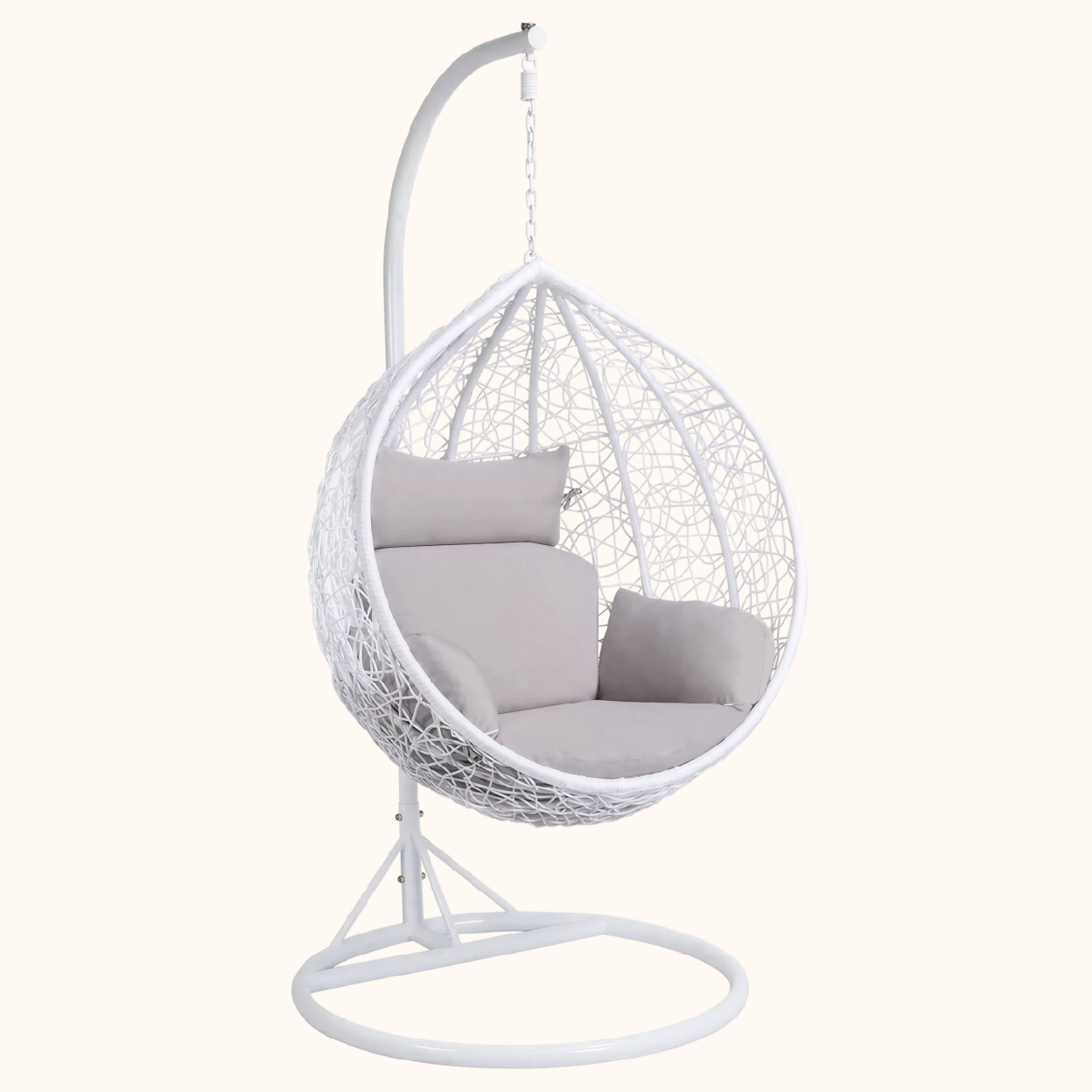 Its suspended design is supported by a strong, powder-coated metal stand with a stable circular base, ensuring durability and balance. The hanging structure allows for a gentle, soothing sway, transforming ordinary seating into a relaxing retreat. Whether you’re enjoying your morning coffee, reading a book, or unwinding after a long day, this chair creates a private sanctuary right in your outdoor space.