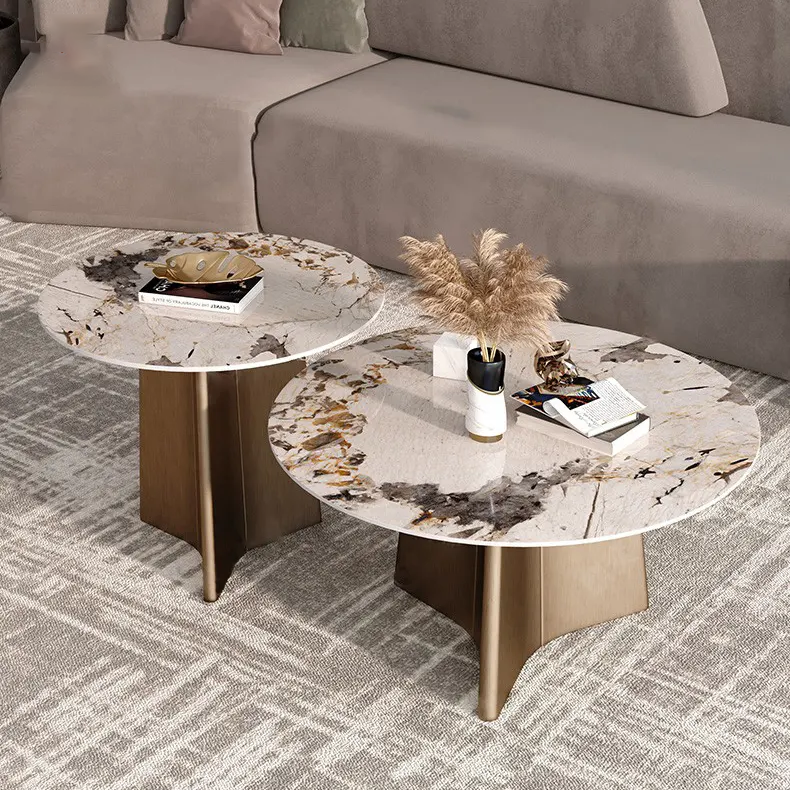 This sophisticated two-piece set features beautifully crafted round tabletops with a rich marble-inspired finish, showcasing dramatic natural veining in warm earth tones. Each surface is smooth, durable, and easy to maintain, offering the upscale look of genuine marble without the high maintenance. The organic patterns ensure that every piece feels unique and refined.