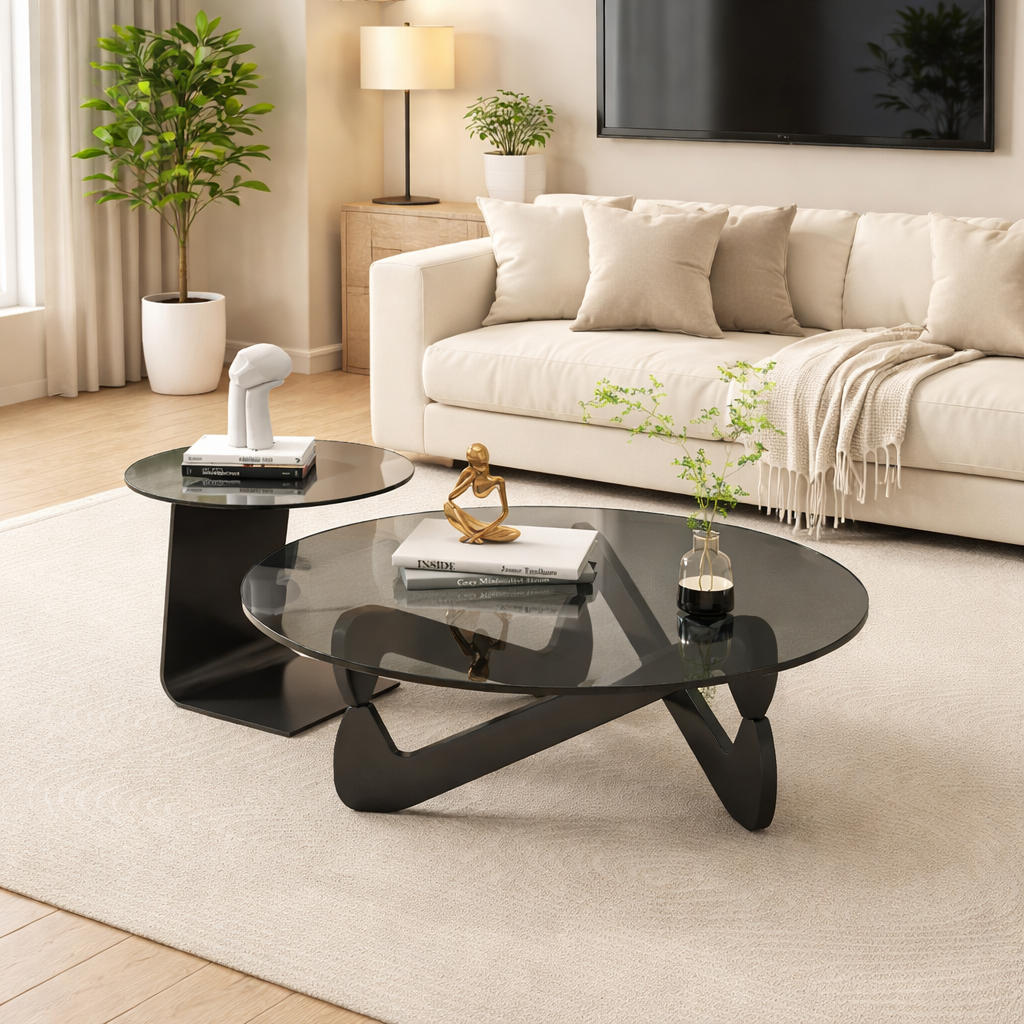 This modern black glass center table set features a sleek tempered glass top and a bold, sculptural matte black base. Stylish and durable, it adds a sophisticated, contemporary touch to any living space while offering practical surface space for décor and everyday use.