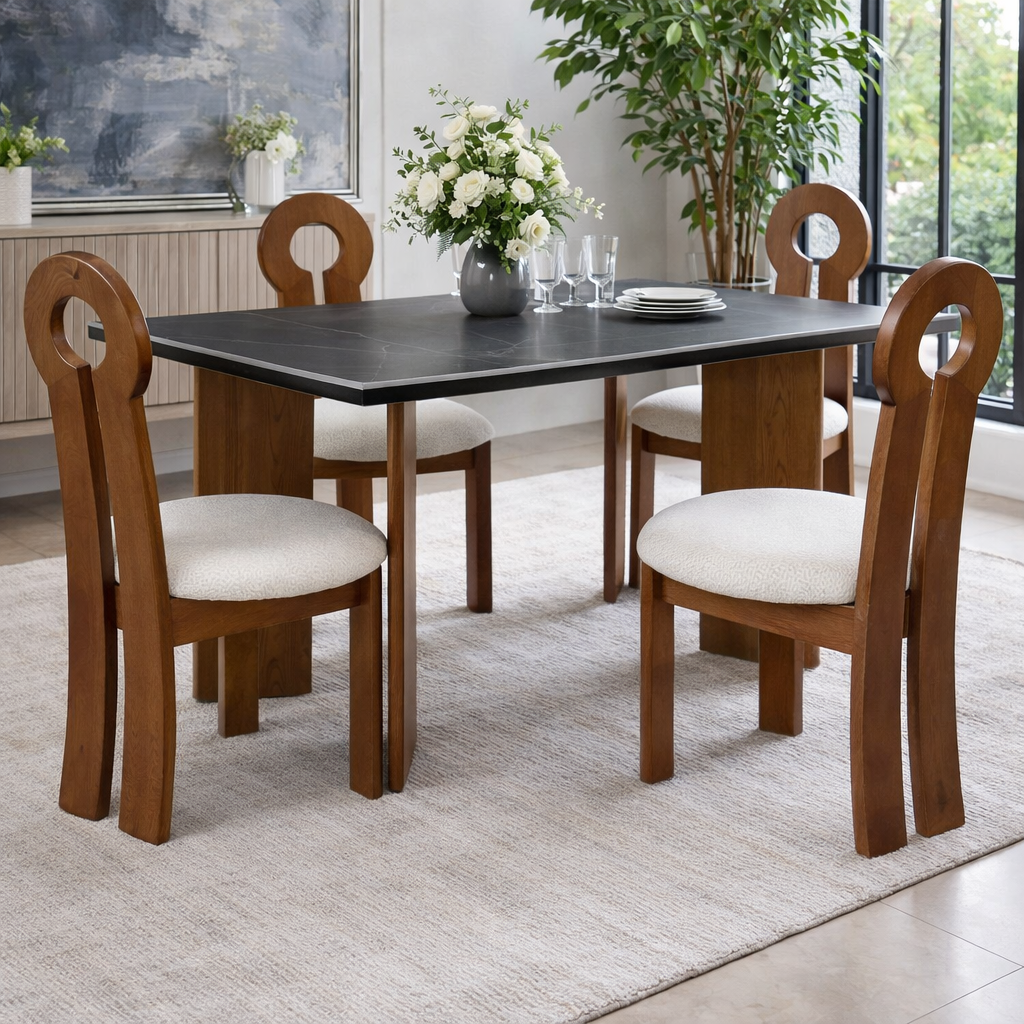 Supported by solid wood legs in a rich natural tone, this table delivers warmth and balance to the dramatic dark top. The sturdy, architectural base not only ensures exceptional stability but also enhances the table’s clean, sculptural silhouette. Every detail is thoughtfully designed to combine durability with aesthetic appeal, making it ideal for both everyday dining and special gatherings.