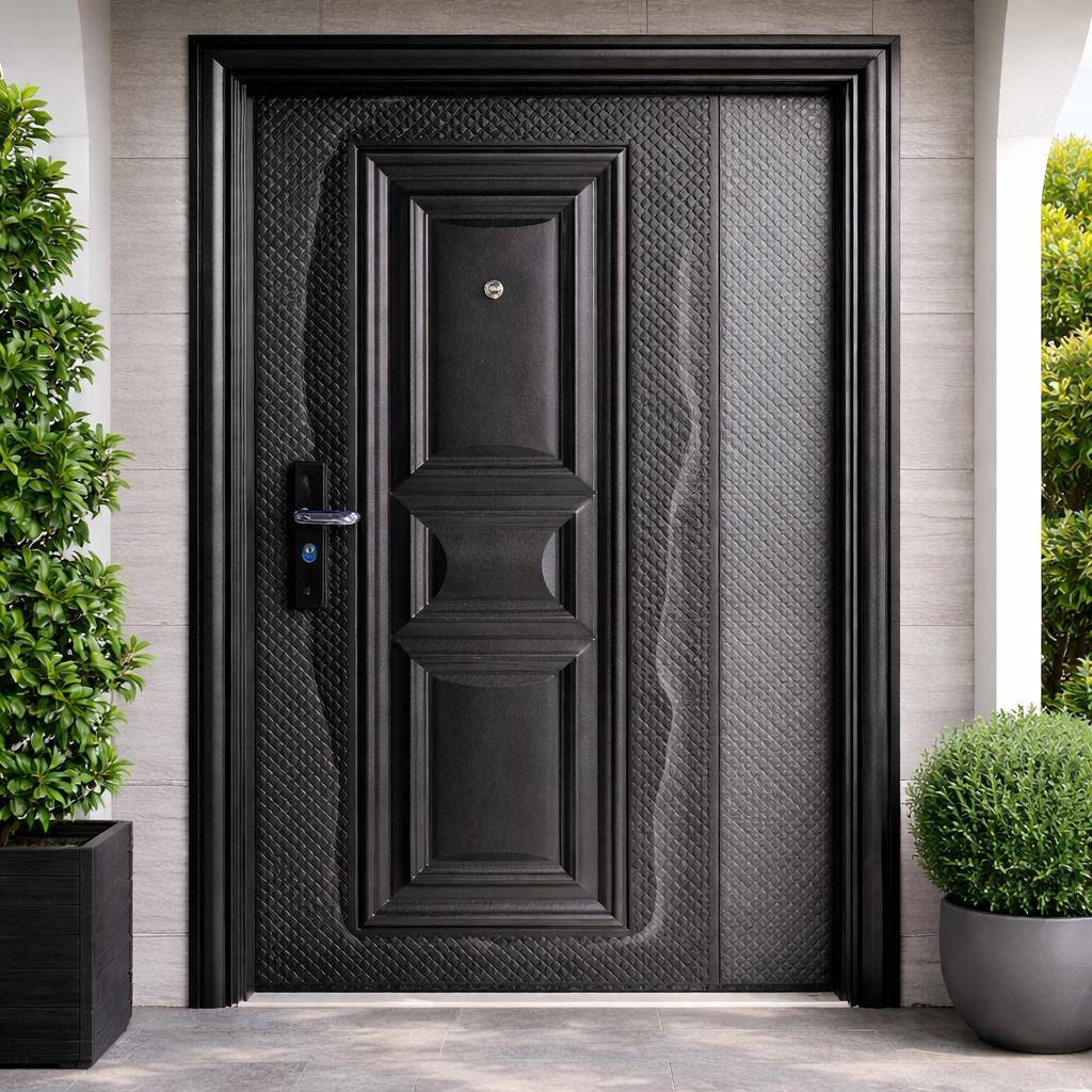 This door is a perfect blend of strength, elegance, and modern craftsmanship, designed to make a bold and lasting impression. Its deep matte black finish exudes confidence and sophistication, instantly elevating the appearance of any entrance. The structured panel design adds depth and character, with clean, geometric contours that create a sense of balance and refined style.