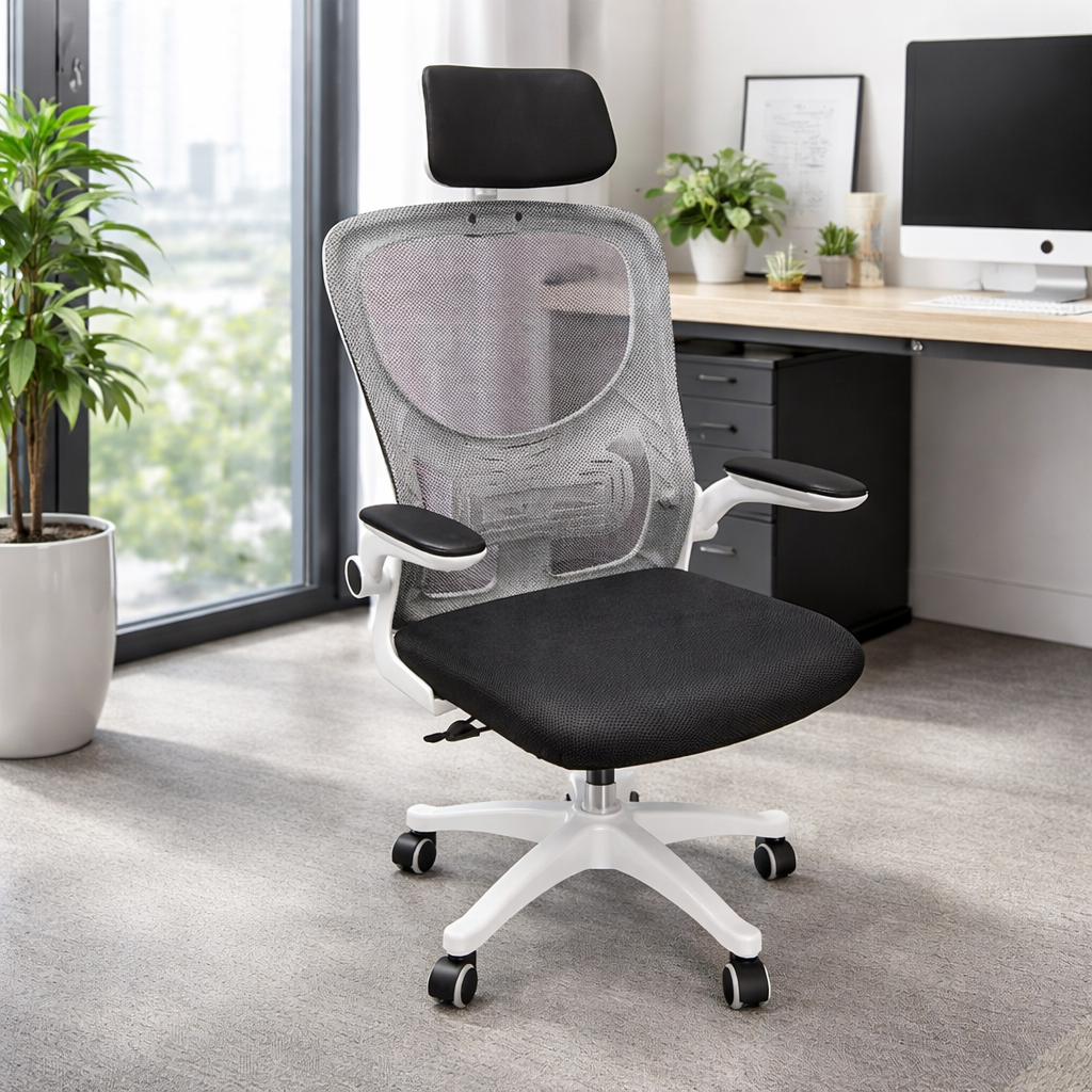 This modern ergonomic mesh office chair is the perfect fusion of style, comfort, and functionality—designed to transform any workspace into a hub of productivity and professionalism. From its sleek white frame to its breathable gray mesh backrest and bold black cushioned seat, every detail reflects thoughtful craftsmanship and contemporary elegance.