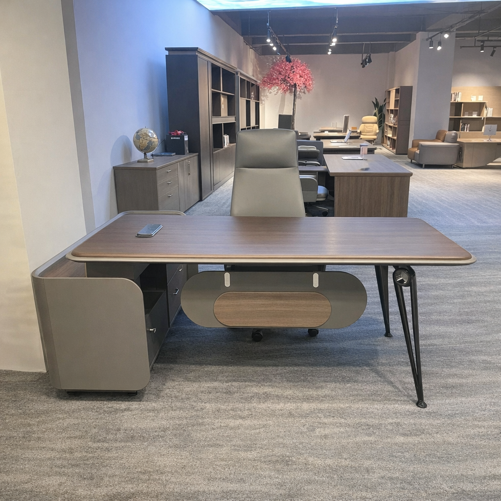 The sturdy metal legs add a modern industrial touch while offering exceptional stability and support. This strong foundation ensures the desk remains firm and balanced, even under heavy equipment. The extended side cabinet enhances functionality with built-in drawers and storage compartments, allowing you to organize files, stationery, and confidential documents neatly. This integrated storage solution keeps your workspace tidy, professional, and efficient.