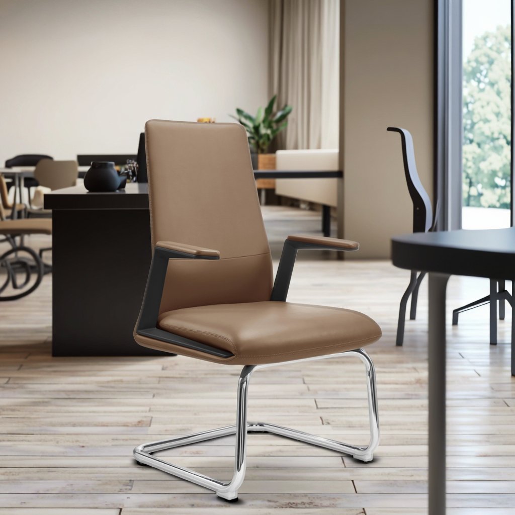 This modern executive office chair features rich brown upholstery, a high supportive backrest, and padded armrests for lasting comfort. Its sleek chrome sled base adds stability and a contemporary touch, making it ideal for professional offices or conference spaces.