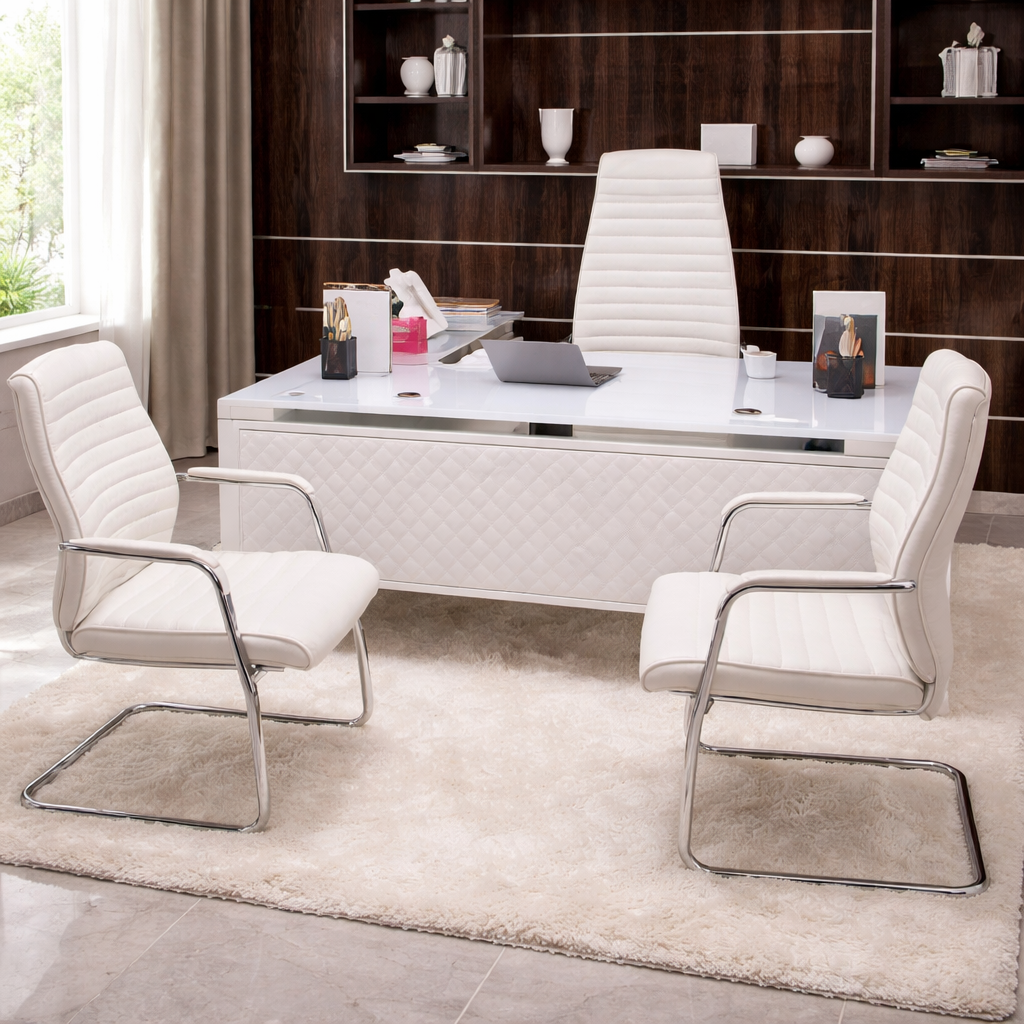 This executive office desk and chair set features a sleek, modern desk paired with comfortably padded, ergonomic chairs. Designed for professionalism and comfort, it offers a clean, elegant look that enhances productivity while creating a polished and welcoming office environment.