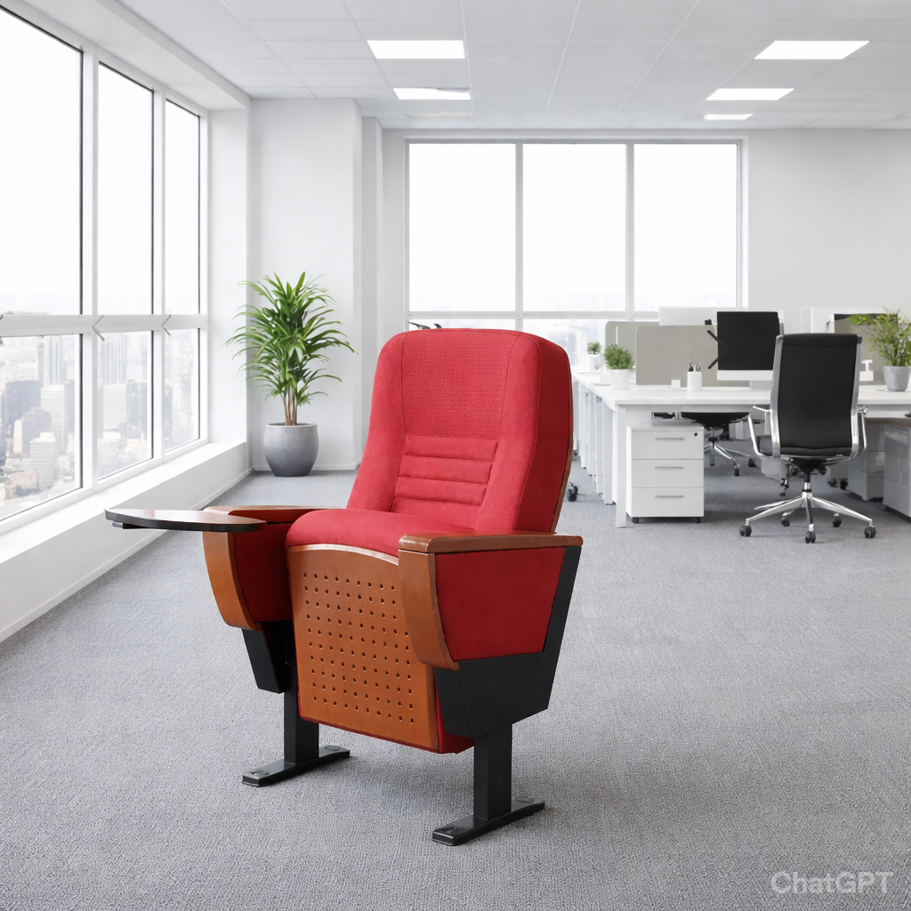 The sides of the chair are framed with warm wooden panels featuring perforated detailing, adding a stylish architectural touch while reinforcing the structure. The integrated writing tablet is seamlessly attached to one arm, creating a convenient surface for note-taking, laptop use, or meetings — perfect for training rooms, seminar halls, and collaborative environments.