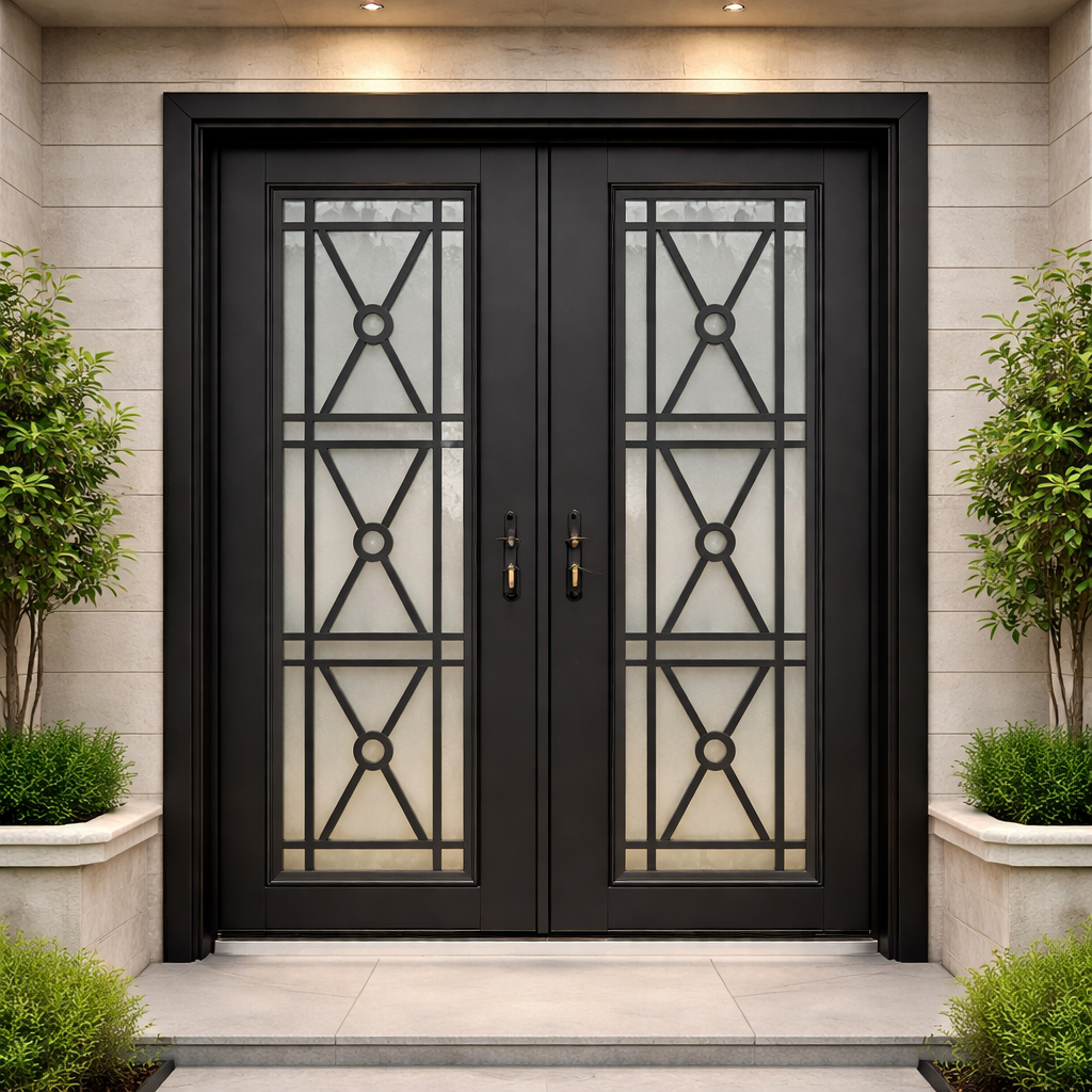 This is a modern double entry door with a sleek black frame and large frosted glass panels. It features geometric metal patterns and a clean, symmetrical design, offering both style and privacy.