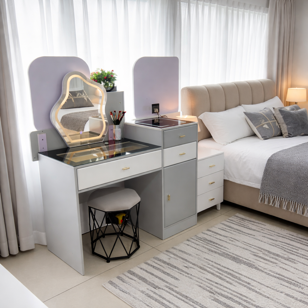 This modern makeup vanity desk is thoughtfully designed to bring both beauty and practicality into bedroom spaces. Its clean, contemporary silhouette blends soft neutral tones with sleek lines, allowing it to complement minimalist, modern, and cozy interiors without overwhelming the room. The compact footprint makes it especially suitable for bedrooms where space efficiency matters, while still providing a complete personal grooming and organization station.
