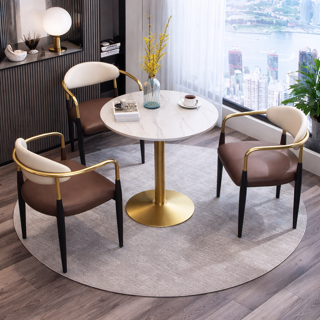 The smooth dual-tone upholstery combines soft cream backrests with rich brown seating, creating a sophisticated contrast that feels warm, inviting, and effortlessly stylish. Generously cushioned seats provide superior comfort, making them perfect for long dinners, relaxed conversations, or casual coffee moments.