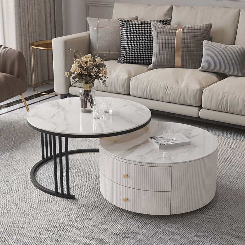 Elegant nested center table set with smooth white marble-effect tops and subtle grey veining, paired with sleek black metal frames for a modern touch. The smaller round table includes built-in drawers with gold knobs, offering convenient hidden storage. Stylish and functional, it adds sophistication and practicality to any living room space.