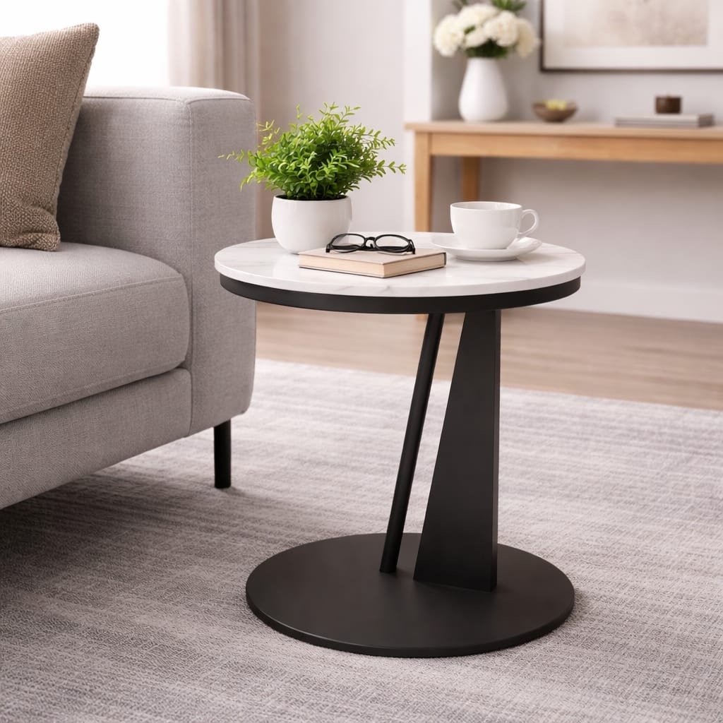 This modern side table features a sleek marble-style round top paired with a sturdy black pedestal base. Its elegant, minimalist design adds a touch of luxury while providing a stable and functional surface for décor, drinks, or everyday essentials in any contemporary space.