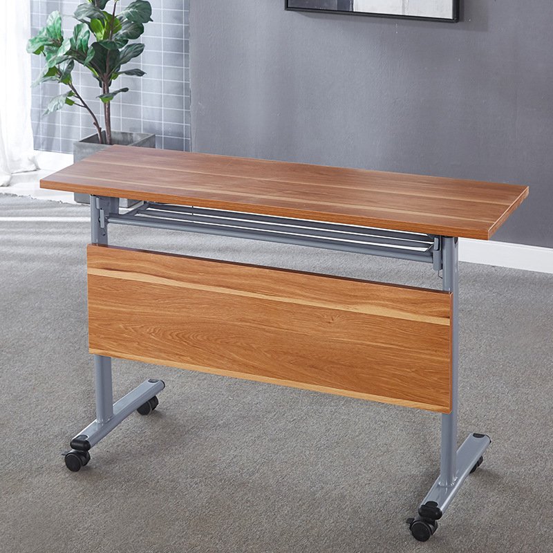 This is a mobile folding desk with a warm wood-finish tabletop supported by a sturdy grey metal frame. It includes smooth-rolling caster wheels for easy movement and a front modesty panel for added privacy, making it practical, flexible, and ideal for modern workspaces or training environments.