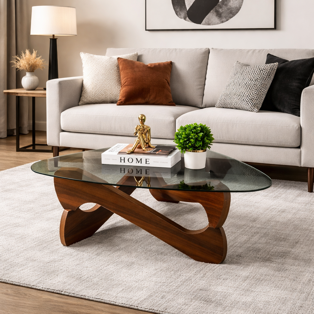 The standout of this center table is its uniquely curved walnut-finished base. Expertly crafted with smooth, flowing lines and an interlocking design, the base creates a striking visual contrast between solid wood and airy glass. Its rich, warm wood tones add depth and sophistication, making it the perfect complement to both modern and transitional interiors. Whether placed on a soft neutral rug or against bold décor, this table anchors the room with refined confidence.