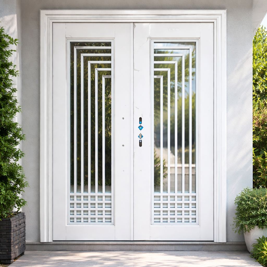 A sleek modern white double security door featuring elegant glass panels with geometric metal designs. It combines strong durability with a stylish finish, allowing natural light in while maintaining privacy and security.