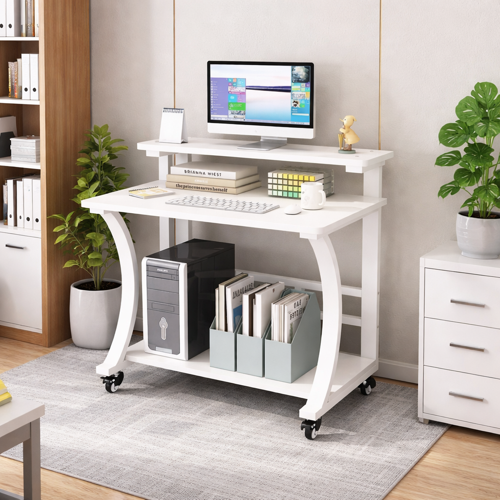 This is a modern white mobile office desk with a two-tier design. It features a spacious work surface, an elevated monitor shelf for better ergonomics, and a lower storage shelf for a CPU and files. The curved side supports add style, while the caster wheels make it easy to move and reposition in any office space.