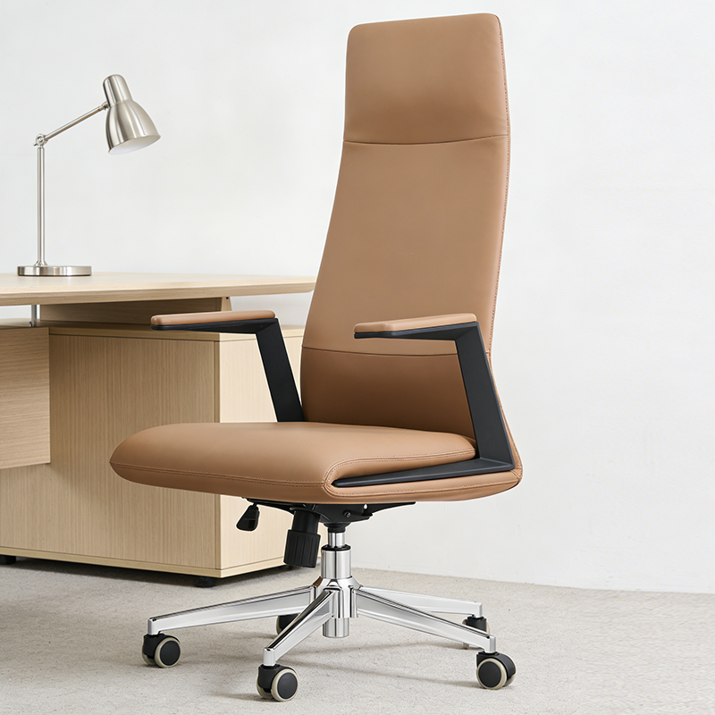 Upholstered in rich, premium-quality leather in a warm caramel tone, this chair immediately commands attention. The tall, sculpted high-back design provides full spinal support, naturally aligning the back, shoulders, and neck to promote proper posture during long meetings or extended work sessions. The plush, high-density foam cushioning ensures exceptional comfort without losing shape, even after 8–10 hours of daily use.
