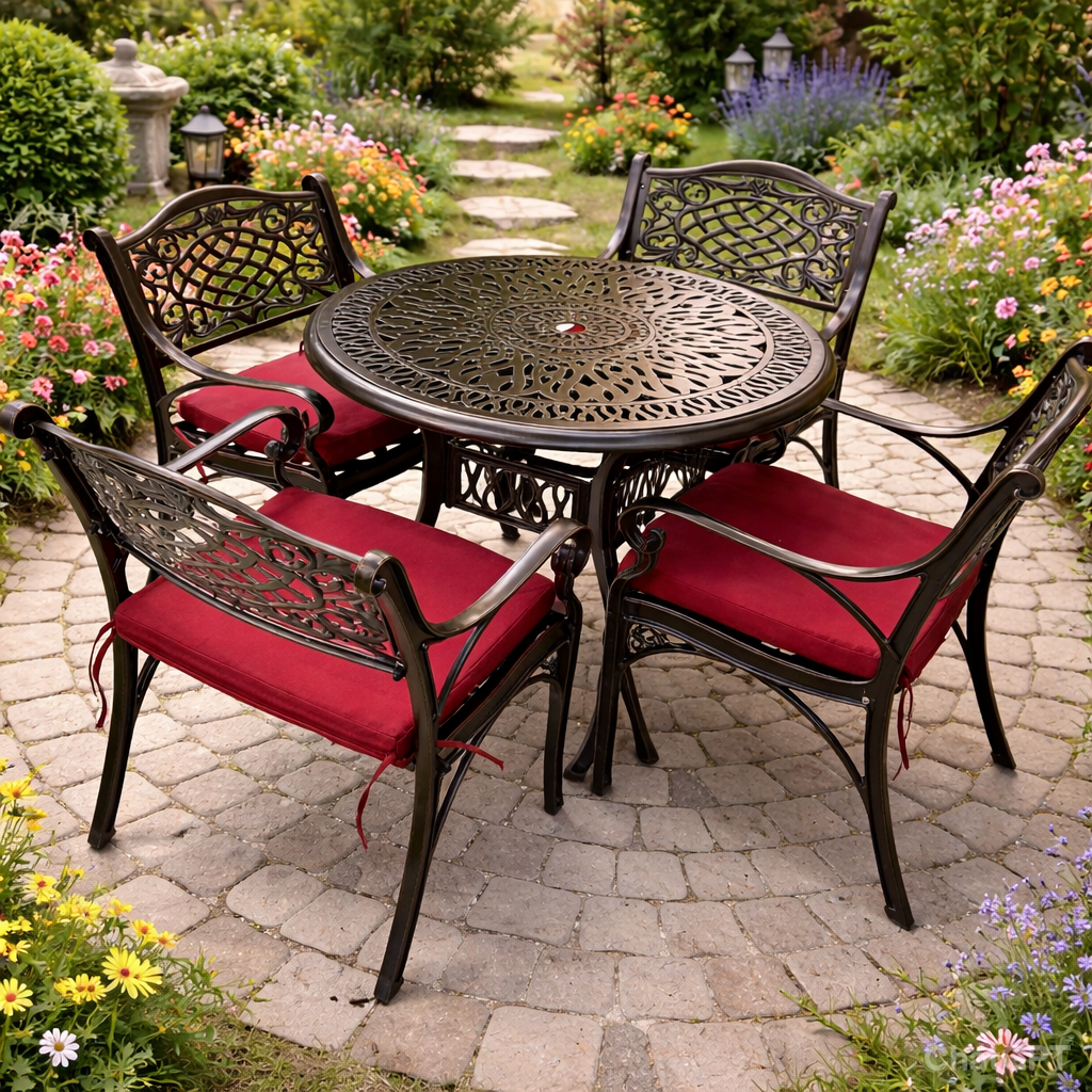 Elegant indoor and outdoor dining set with beautifully crafted cast-aluminum table , intricate lattice detailing and four matching armchairs. The rich dark metal frame is complemented by plush red seat cushions, creating a bold yet sophisticated look. Designed for durability and comfort, it is perfect for patios, gardens, and outdoor entertaining spaces.