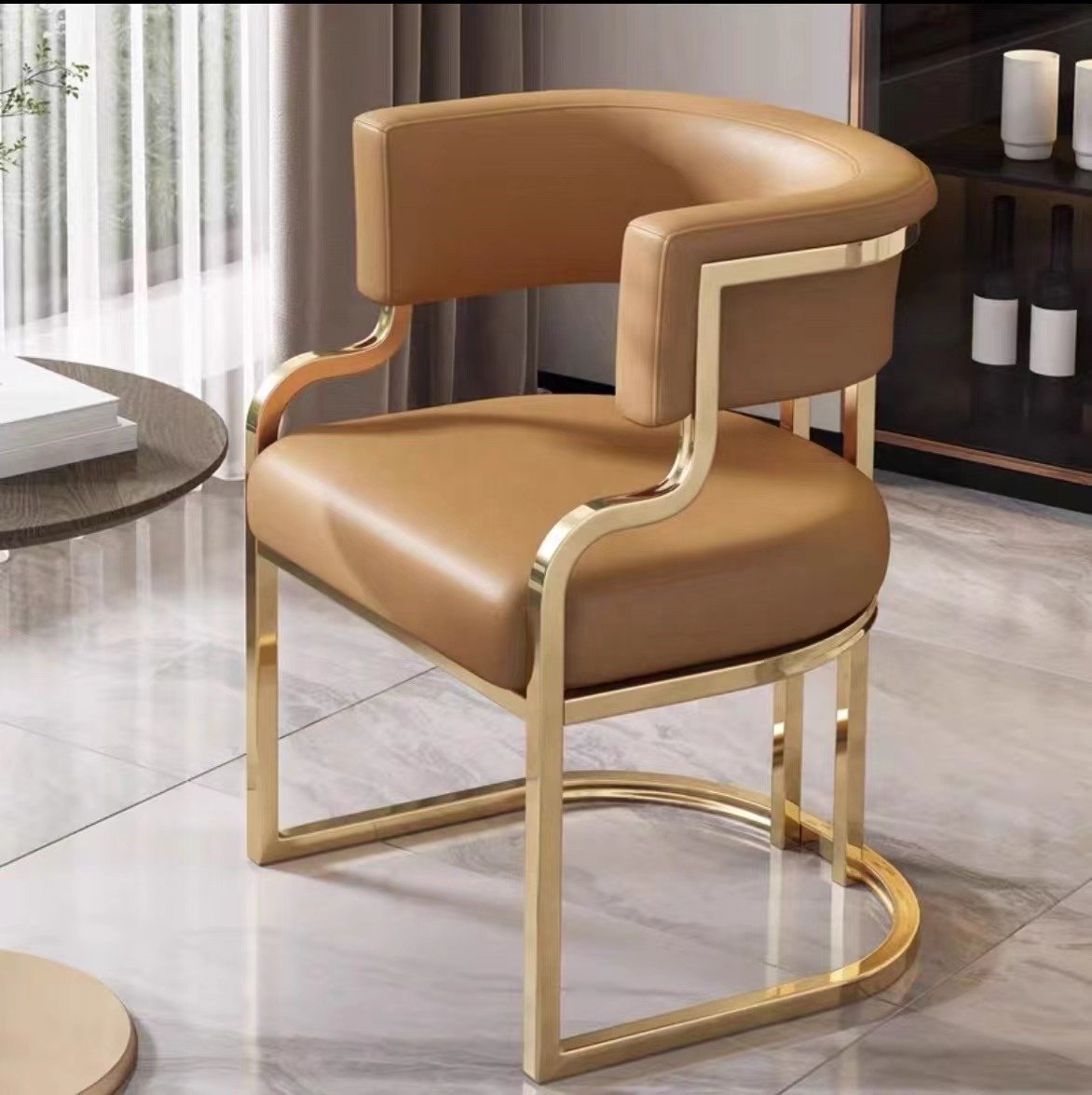This elegant accent chair features smooth caramel-toned upholstery paired with a polished gold metal frame. Its curved backrest and cushioned seat provide comfort, while the sleek sled-style base adds a modern, luxurious touch.