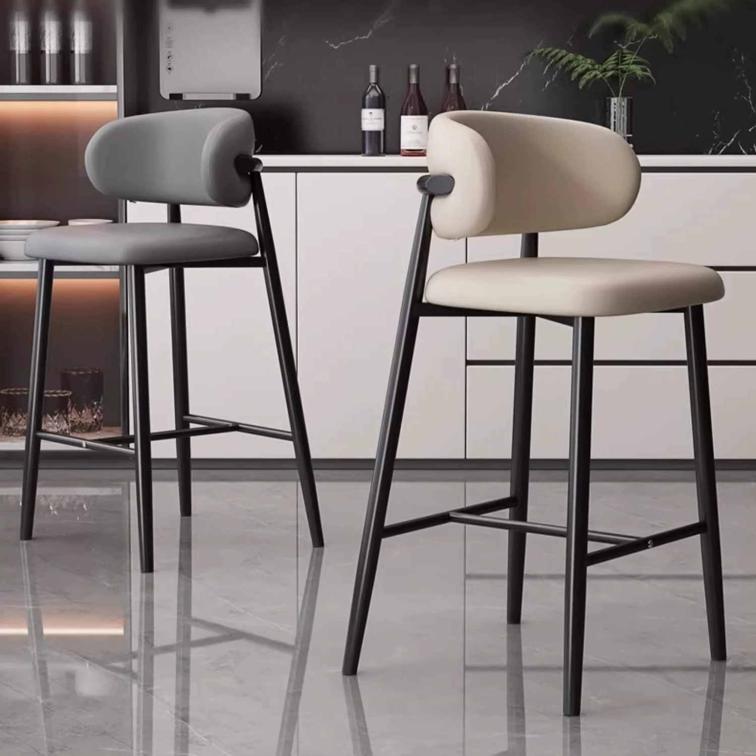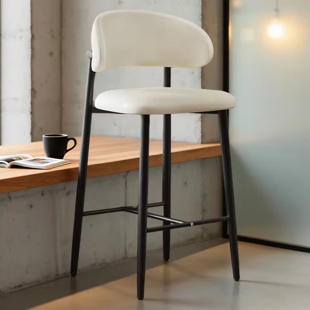 The slim black metal legs introduce a sleek architectural contrast to the plush seats. Their tapered form keeps the design light and airy, while the reinforced footrest bars add both structural stability and everyday convenience. The footrests are thoughtfully positioned to support natural posture, making the stools comfortable for extended seating whether placed at a breakfast counter, high dining table, or bar area.