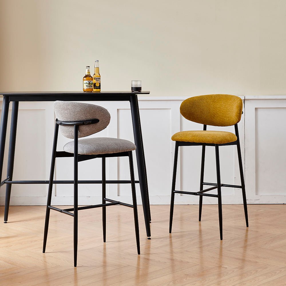 Sleek, modern silhouette , softly curved upholstered seats and slim black metal legs. A combination of textured fabric in neutral grey and warm mustard tones adds a contemporary yet inviting feel. Their minimalist frame, elevated height, and clean lines make them perfect for modern kitchens, home bars, or stylish café settings.